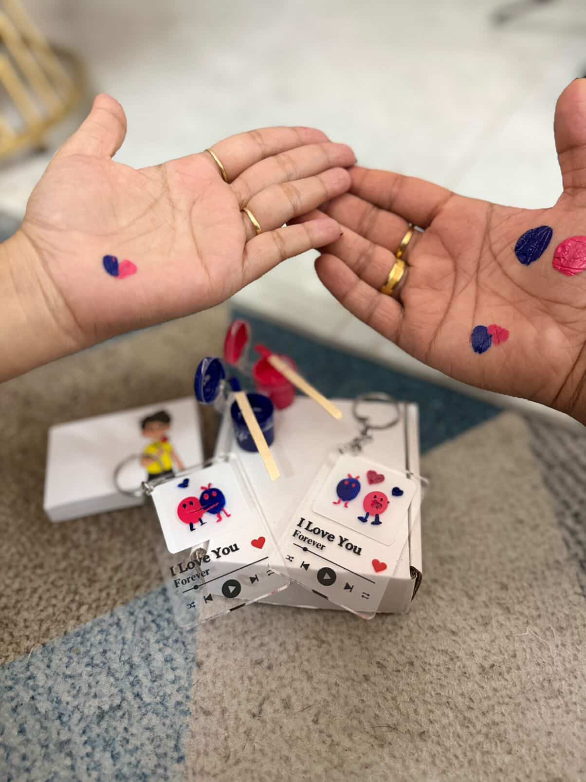 Perfect for proposals, anniversaries, or romantic gestures, this set combines the magic of a handmade flipbook with the personal touch of your combined fingerprints. Each keychain becomes a unique symbol of your connection—a daily reminder of your love story, crafted together by your own hands.
